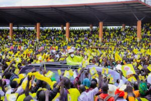 In Terego district, the NRM flag bearer arrived to thunderous cheers, ululations, and dancing crowds dressed in party yellow colors and delivered a fiery message focused on wealth creation, accountability, and national unity.