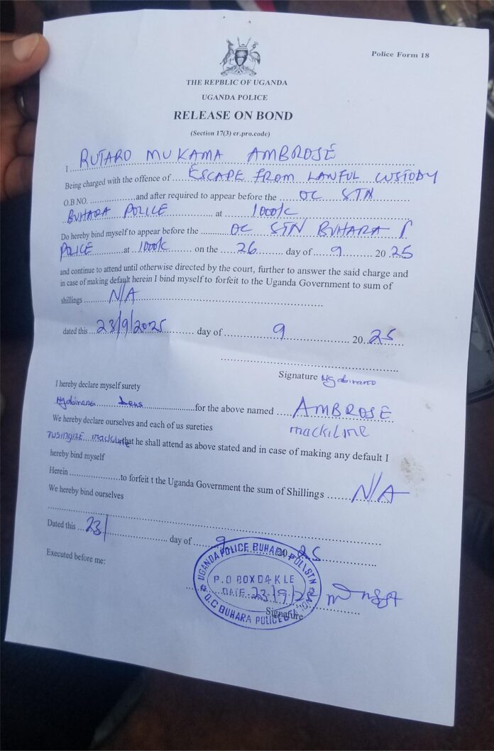 According to a police bond form signed , September 23, Turamyomwe was charged with “escape from lawful arrest,” but no details were provided.