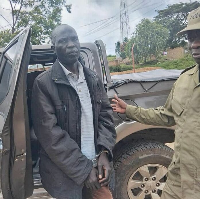 John Taban Moro, the Koboko Parish Chief in cuffs being escorted to the Koboko Chief Magistrates Court.