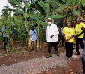 In Mukono District, Museveni visited Harriet Nampa, a PDM success story who started a piggery project and later expanded into dairy farming after getting funding from PDM in 2025.