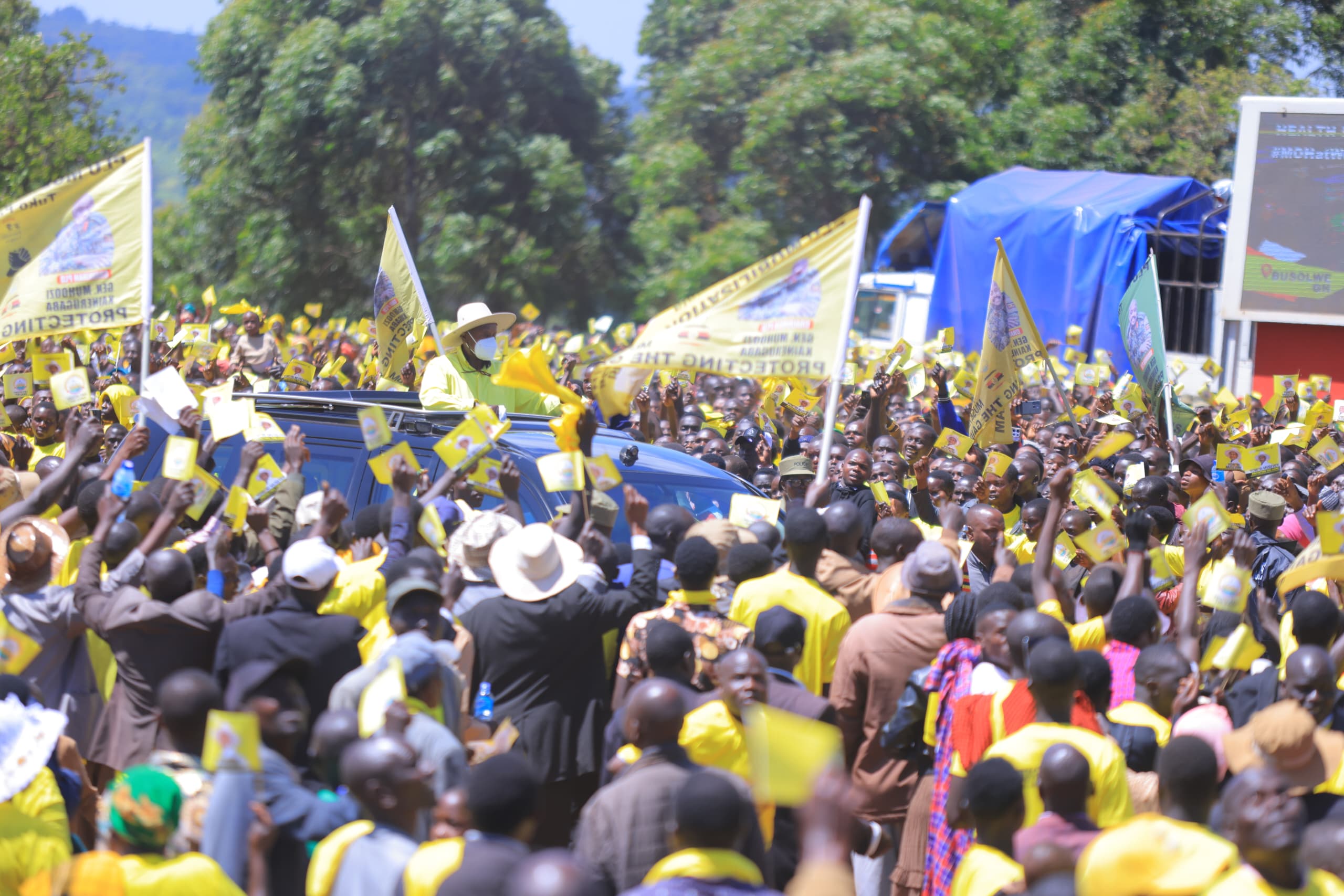 In Kween district, during a rally at Binyiny Primary School Grounds, Museveni launched an aggressive anti-corruption campaign targeting officials accused of stealing Parish Development Model (PDM) and road funds.