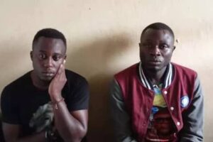 Hillary Byaruhanga (L) after being apprehended in Kanungu district