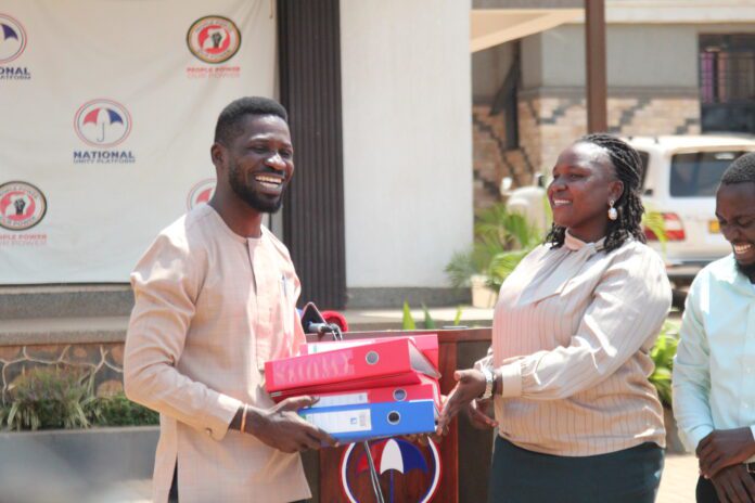 Harriet Chemutai, head of the NUP Election Management Committee (EMC), handing over the partial list of vetted local government candidates to the NUP party President Kyagulanyi at the party headquarters on 29th August, 2025.