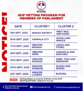According to the schedule, Wakiso, West Nile, and Kigezi will be vetted first, followed by Kampala, Acholi, and Ankole on September 16. The process will then move through other regions before concluding with Bugisu, Greater Luwero, and Busoga on September 20–21.