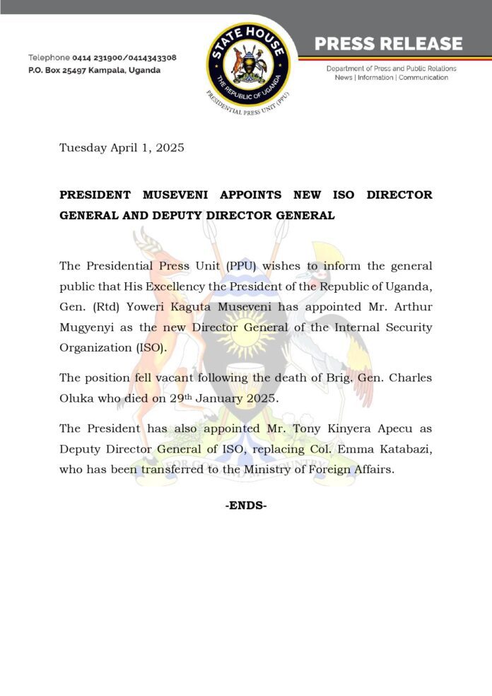 BREAKING NEWS President Museveni Appoints Arthur Mugyenyi new ISO Boss By Daisy Ssawe - April 1, 2025 433 Share FacebookTwitterWhatsAppEmail