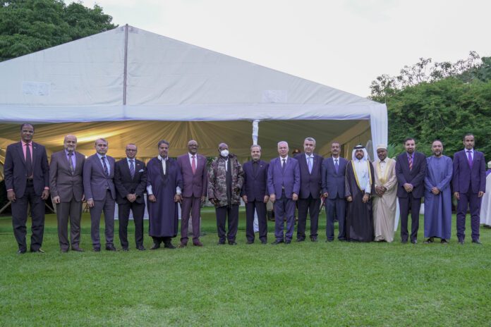 President Museveni poses for a photo with delegates from the Middle East Muslim Community during the Iftar dinner at State House, Entebbe on 5th March 2026.