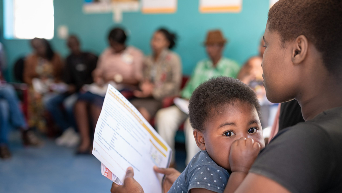 A mother awaits treatment at clinic with infant.